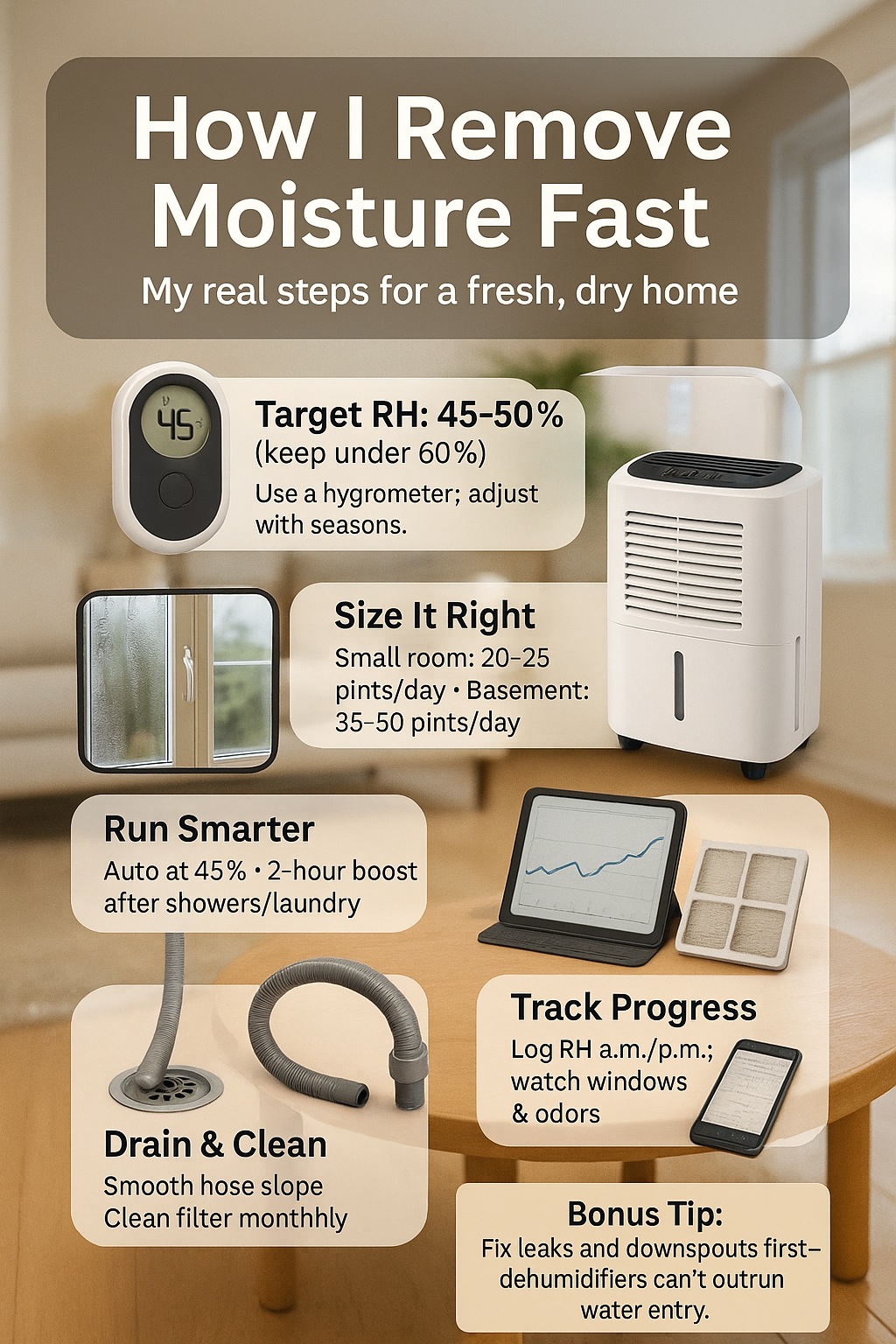Choose a humidity targetâ45% is my sweet spotâand verify with a hygrometer. Measure rooms so you know whether a 20-, 35-, or 50-pint unit makes sense. Numbers beat guesswork. If you see window fog or smell must, start there and work outward.