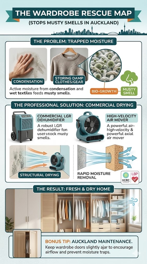 To eliminate musty smells, you must address the root cause: trapped moisture. Commercial drying equipment uses high-capacity airflow and refrigerant technology for rapid moisture removal. This process stops mould growth in wardrobes and basements, ensuring your indoor air remains fresh and healthy.