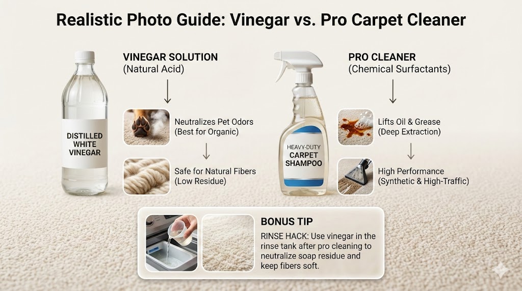 Choosing between a commercial carpet cleaner and distilled white vinegar depends on your specific stain type and fiber material. While natural acidity works for odors, professional surfactants are often required for deep oil-based extraction for high-traffic areas and synthetic fibers.