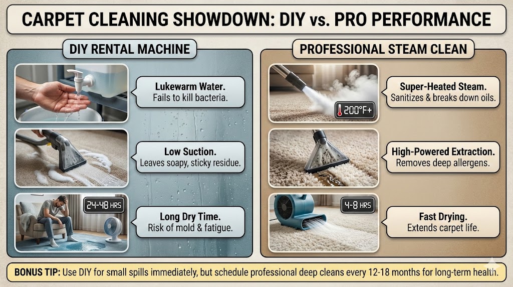 Deciding between a carpet cleaner vs professional service involves weighing machine power against deep results. While home units offer convenience, professional steam cleaning utilizes high-heat extraction to remove deep-seated allergens and bacteria that standard consumer-grade vacuums simply cannot reach effectively for long-term health.