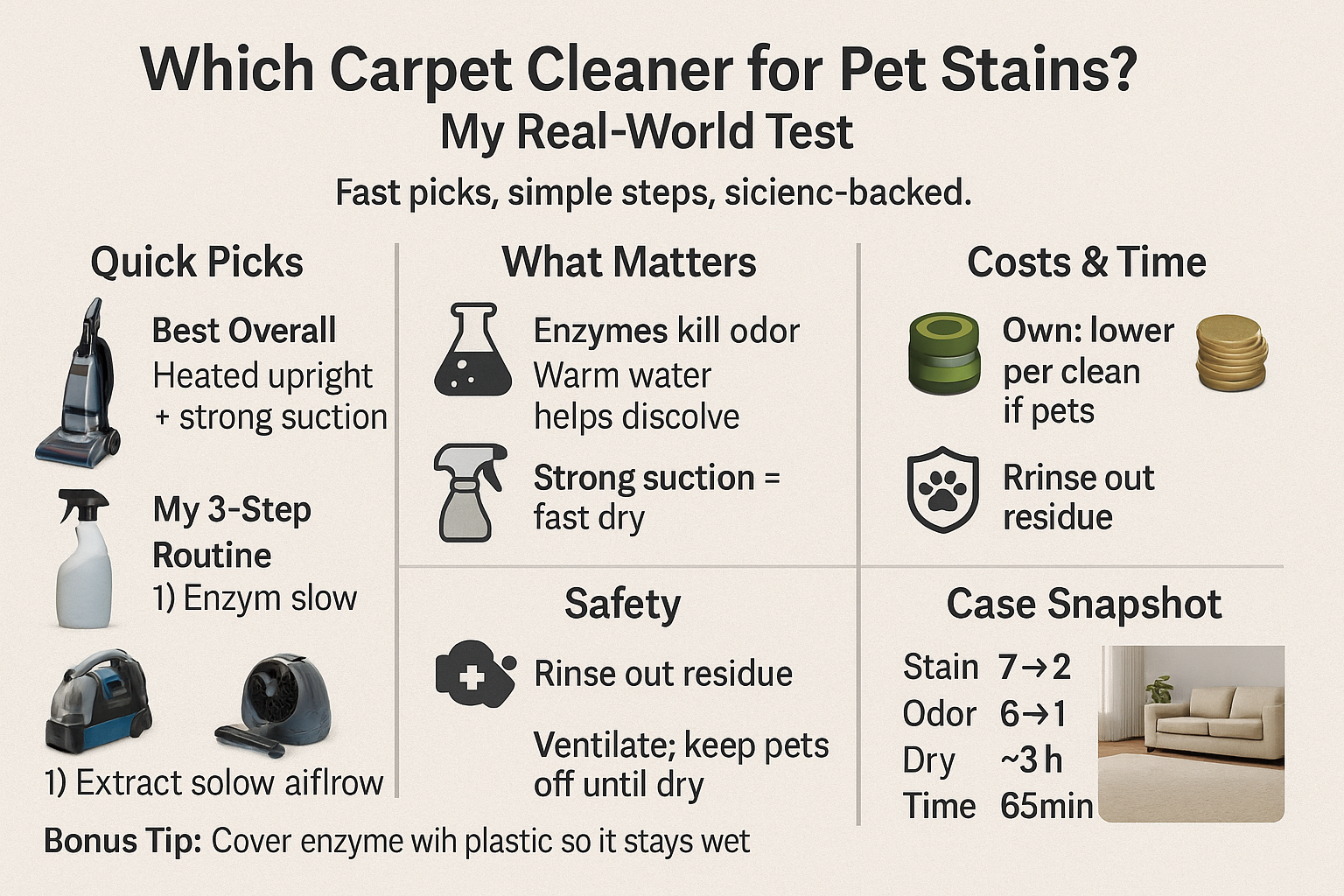Looking for which carpet cleaner is best for pet stains? This guide explains how enzyme carpet cleaner formulas, heated extraction, and suction affect stain lift and pet urine odor removal on fresh and set-in messes. Includes quick picks, safety notes, costs, and a real case study.