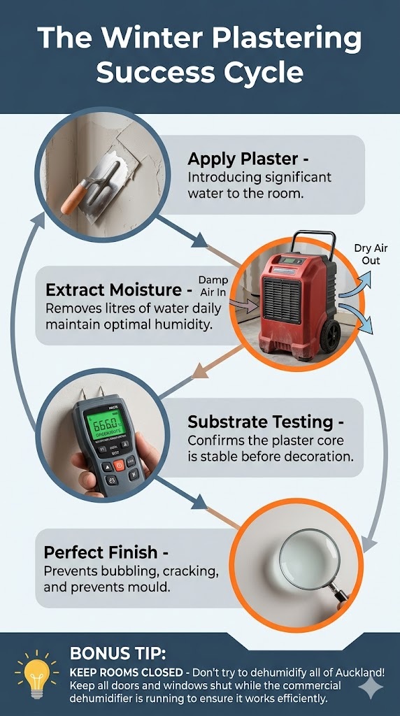 Using a commercial dehumidifier during winter plastering prevents mould growth and structural cracks. By maintaining optimal humidity, these units accelerate drying times in damp Auckland conditions, ensuring a high-quality finish and protecting the integrity of your interior wall materials and paint.