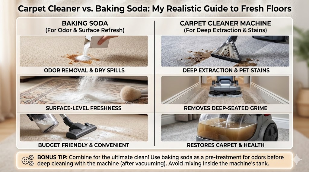 Choosing between a carpet cleaner machine and baking soda depends on the mess. While baking soda effectively neutralizes odors and absorbs light moisture, professional-grade carpet cleaners use extraction technology to remove deep-seated allergens, grime, and stubborn stains that powder alone cannot reach.