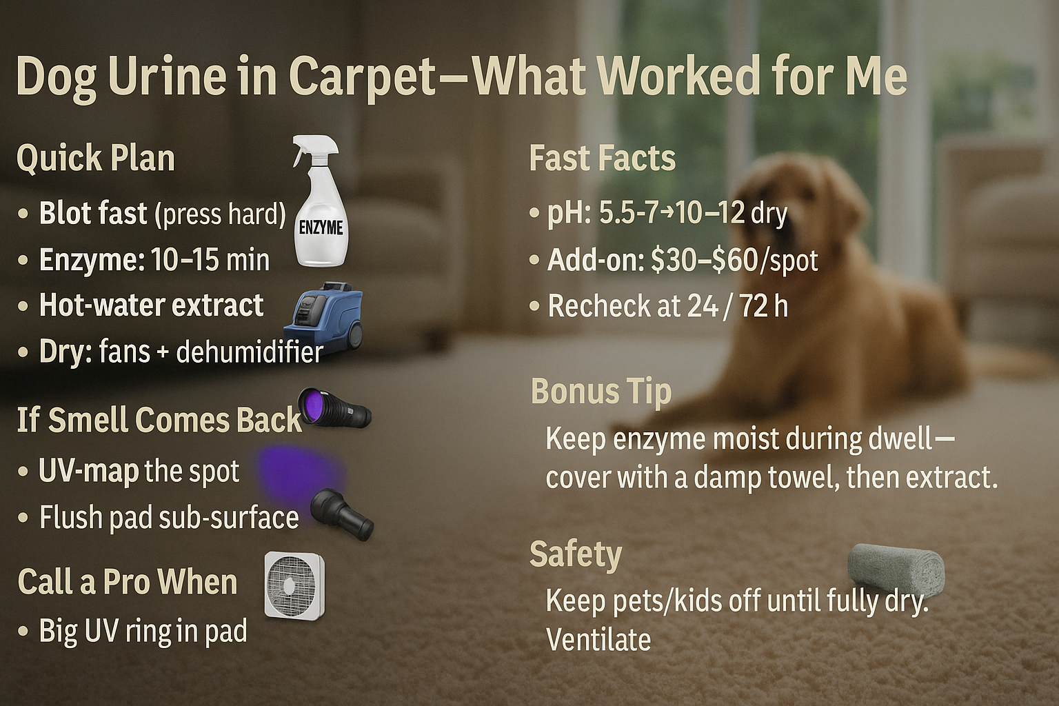 Here’s my quick script: blot hard for two minutes; apply enzyme; set a 12-minute timer; extract gently; set fans and crack a window; leave a folded towel weighted over the spot for 30 minutes; check again at 24 hours; re-check at 72 hours. If odor lingers, move to sub-surface steps.
