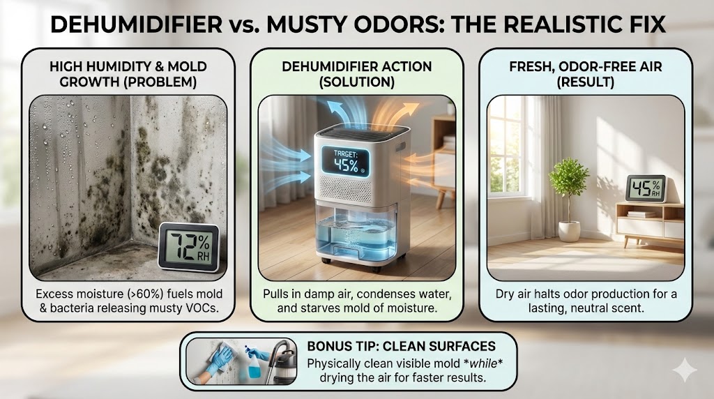 Will a dehumidifier remove musty smell? Yes, a dehumidifier eliminates musty odors by maintaining relative humidity below 50%, which stops the growth of odor-producing mold and mildew. By removing excess moisture, it strikes at the root cause of the scent rather than just masking it.